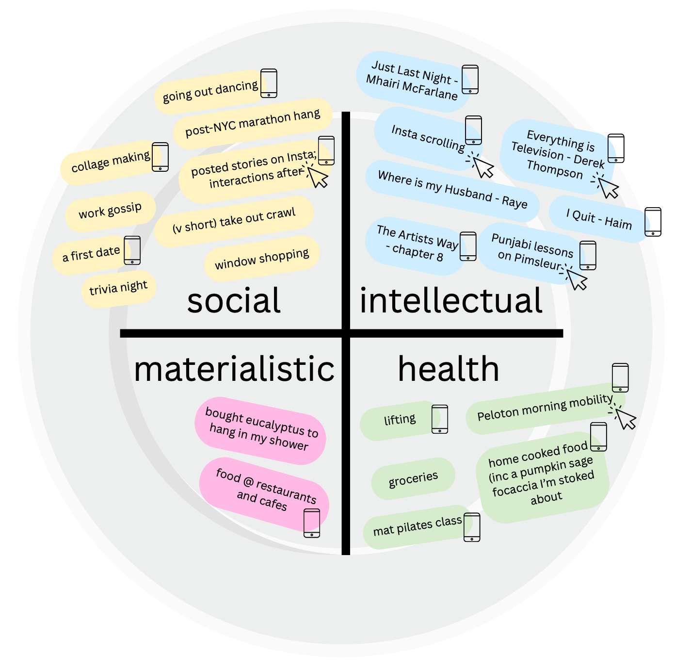 Visualizing my consumption in this way has made me realize I might be socializing too much, but I’m pretty happy with the materialistic, health, and intellectual buckets. I do feel guilty about scrolling Insta, but maybe I shouldn’t since it’s just a bite on a full plate - I’m still living my life and using my phone for other beneficial things.
